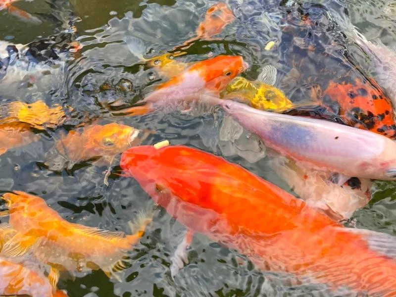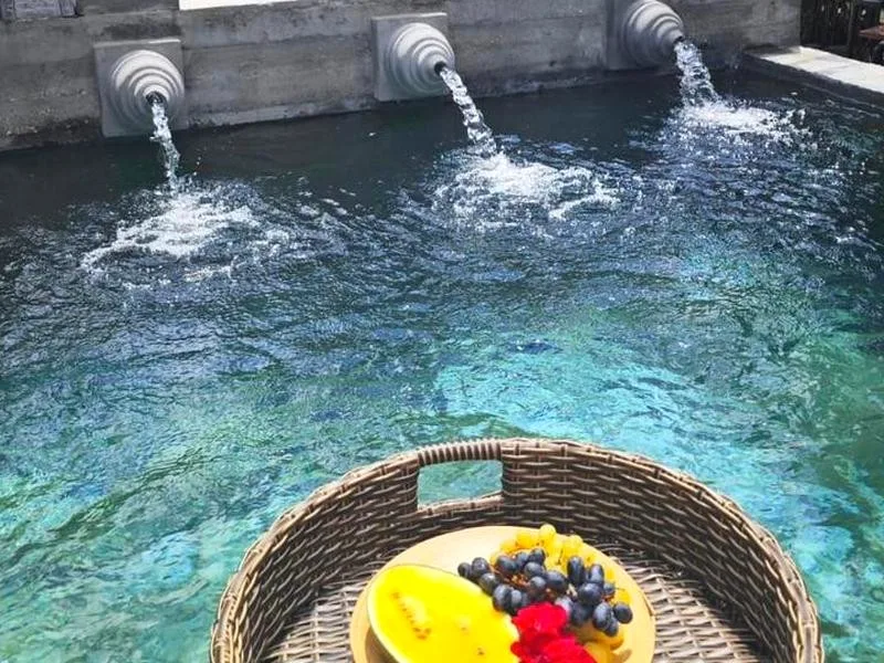 На территории располагается водный сад карпов Кои, это декоративные рыбки плавающие в воде из подземного озера. По желанию можно искупаться в купели.